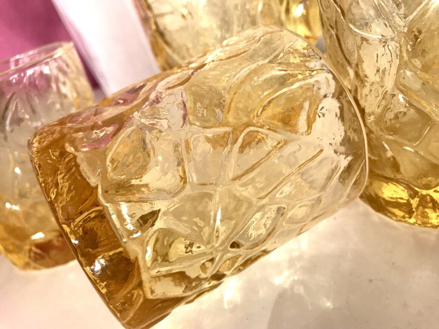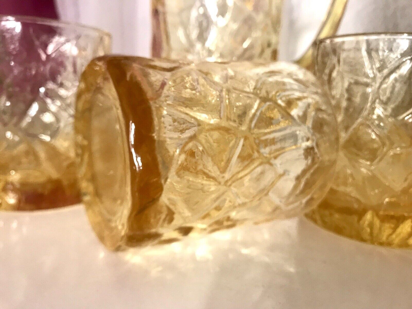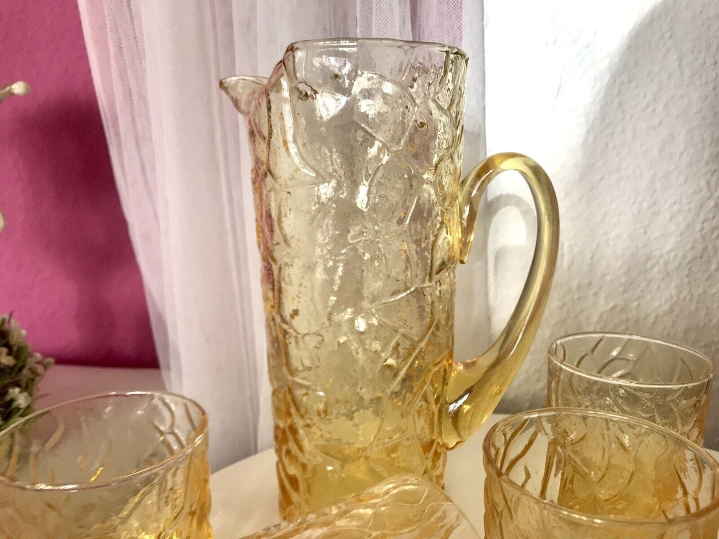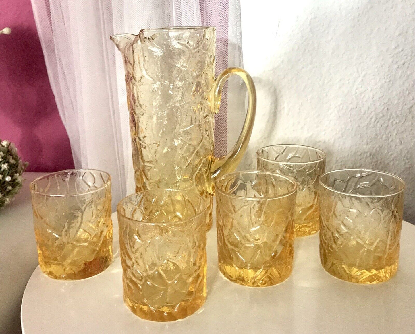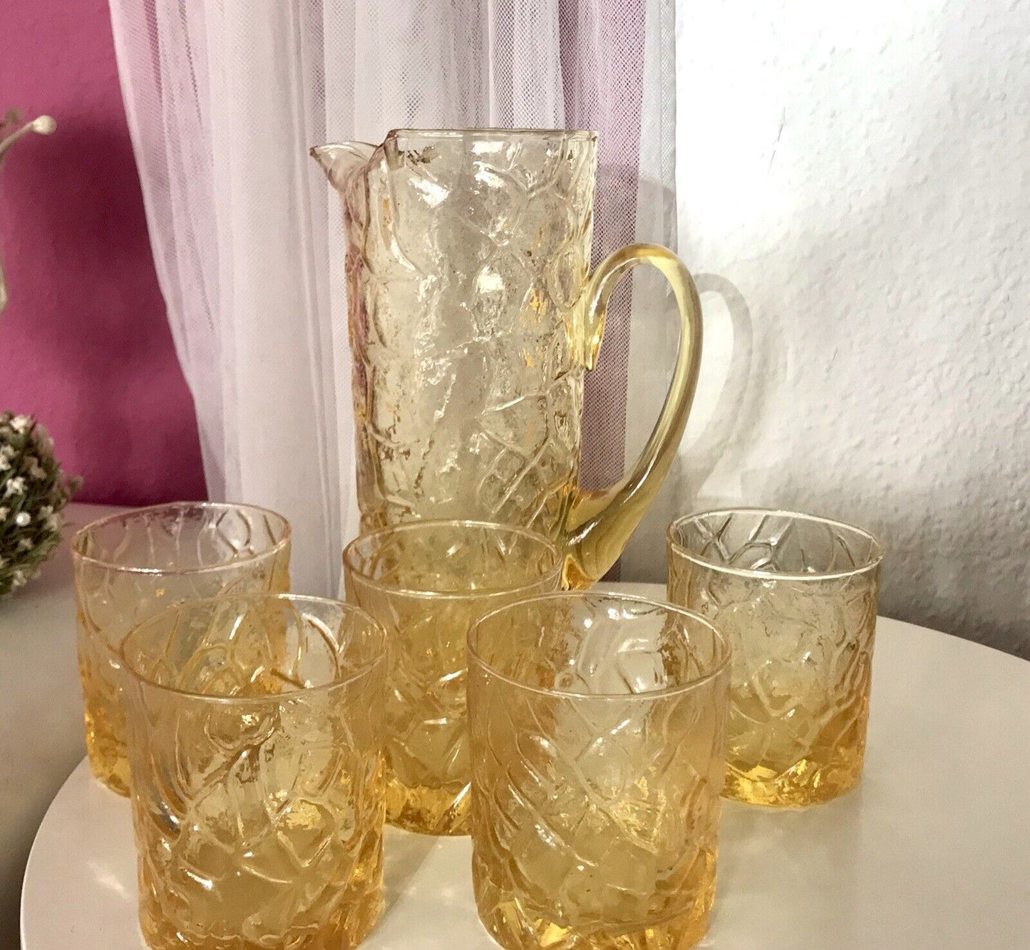 Vintage Designer 60er 70er Krug Kanne Karaffe 5 Becher gelb Glas Reptil Struktur