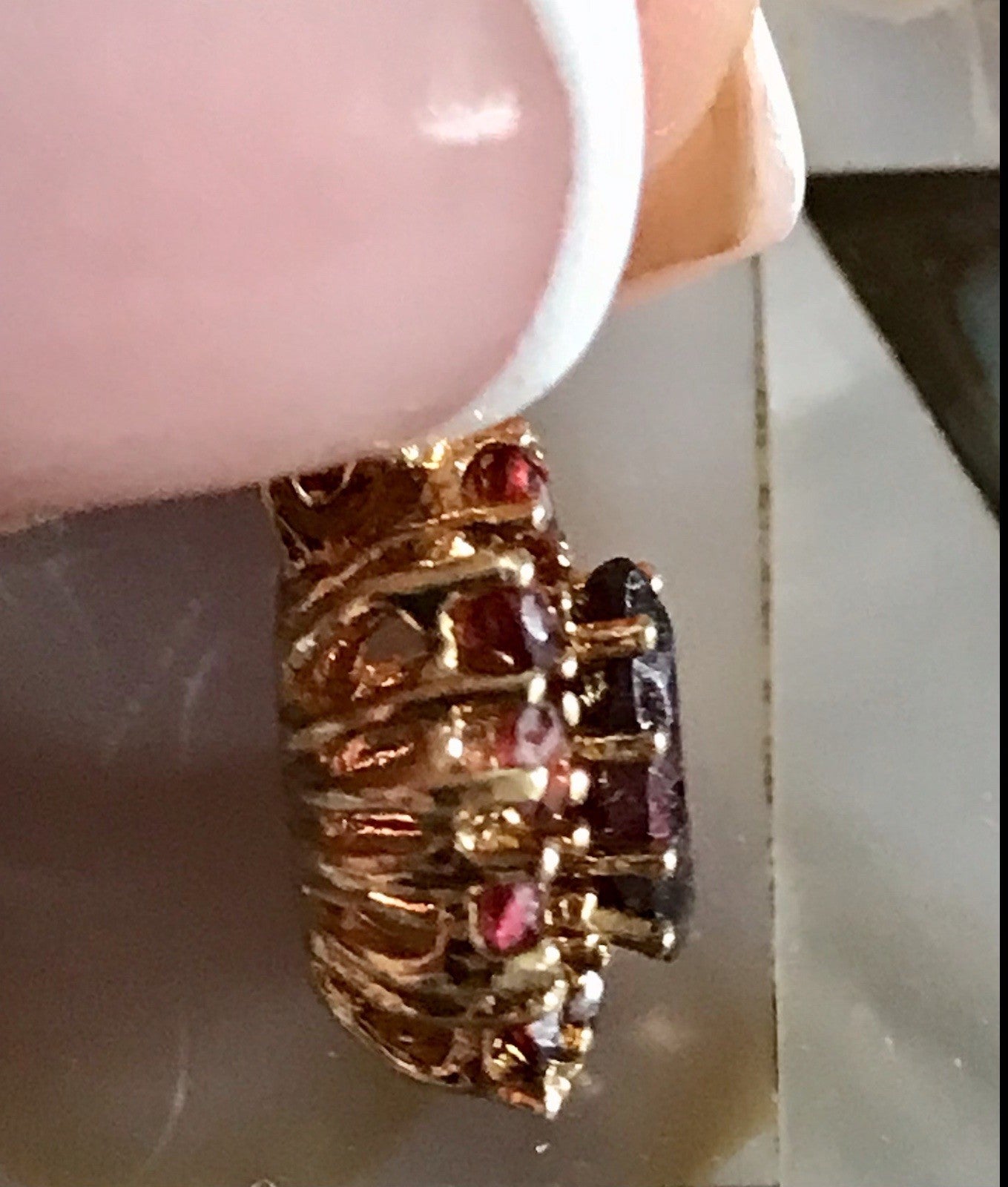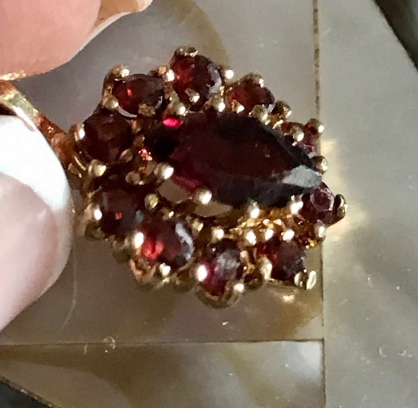 Eine ovale Blüte darstellend, gefasst mit einem mittigen spitzovalen hochgefassten Granat und wundervollen super geschliffenen um sie gefassten in Krappenfassung roten runden Granatsteinen