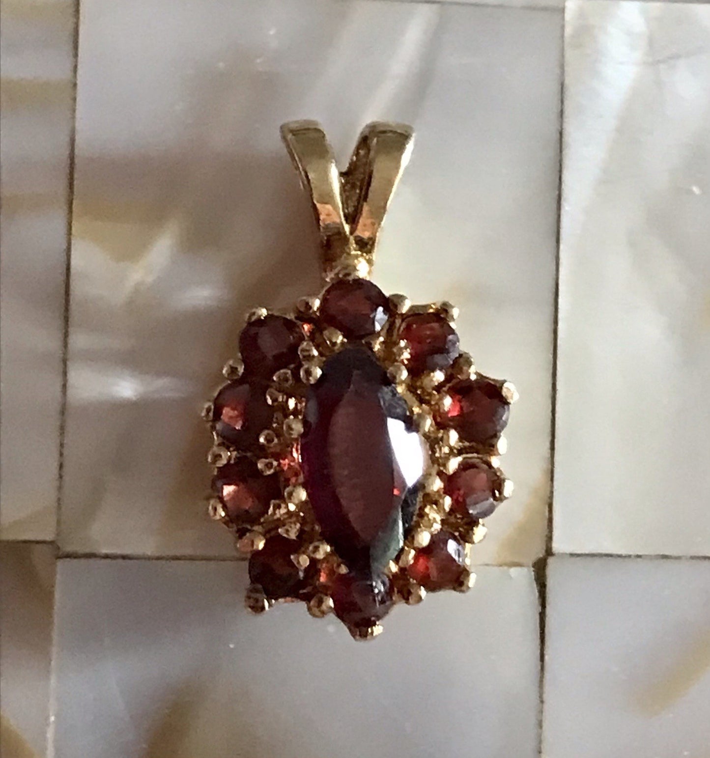 Kommodengriff präsentiert einen wundervollen edlen zauberhaften alten Vintage vergoldeten Kettenanhänger Anhänger aus 835er Silber und wunderschönen roten geschliffenen Granatsteinen/Granaten