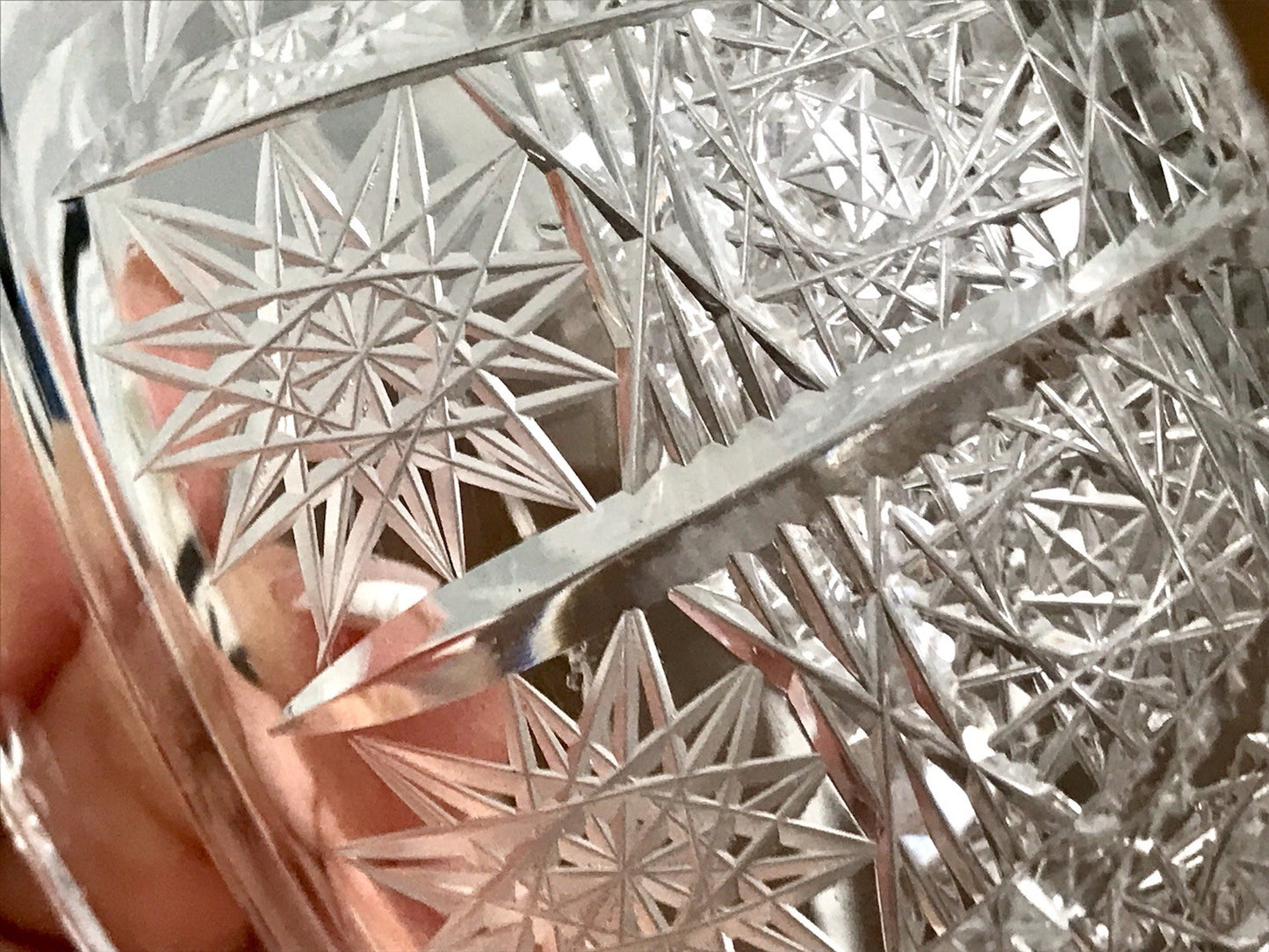 Aus mundgeblasenen unglaublich aufwändig geschliffenen geschnittenen farblosem Kristallglas.
