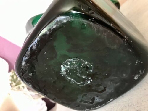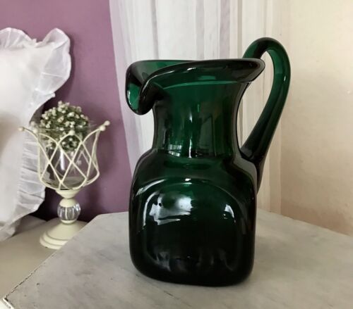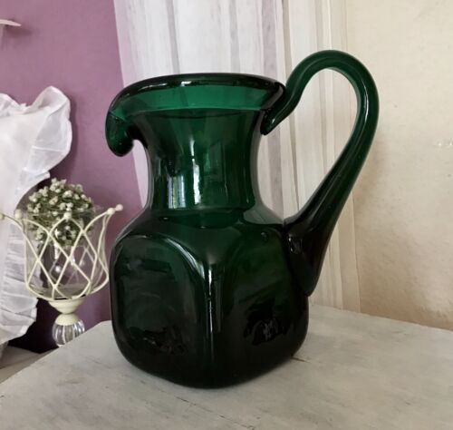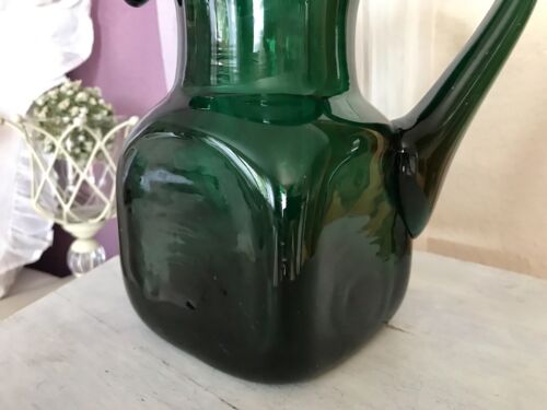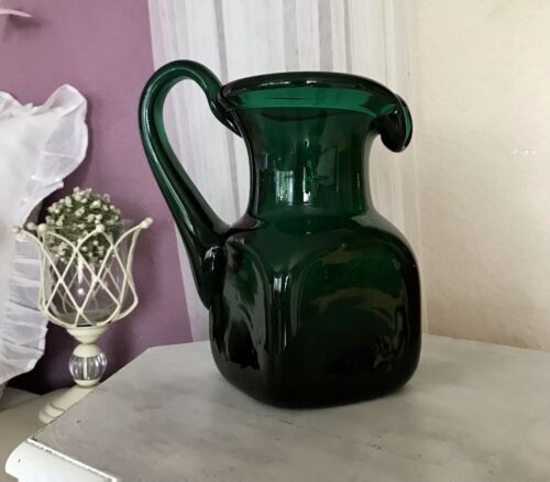 Kommodengriff präsentiert einen wunderschönen älteren edlen Vierkant-Krug Glaskaraffe Karaffe Henkelkrug Kanne aus tief grünem massivem Glas mit Abriss