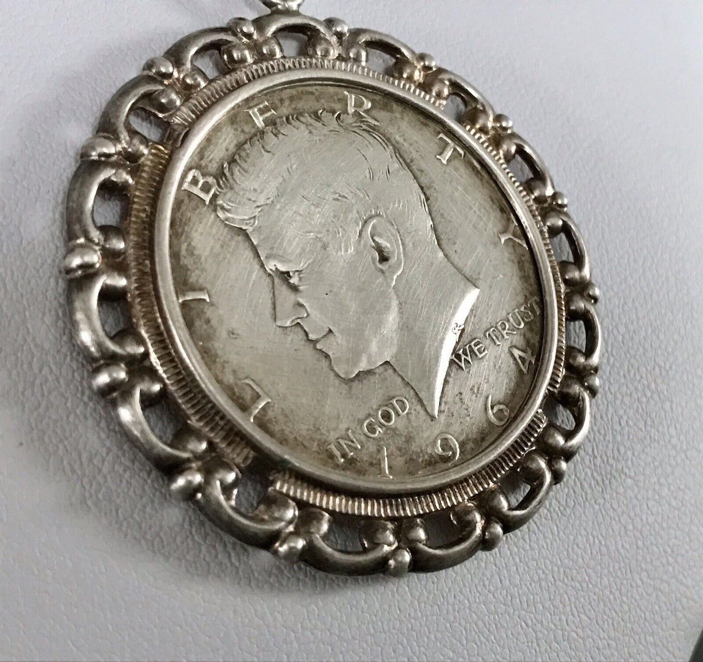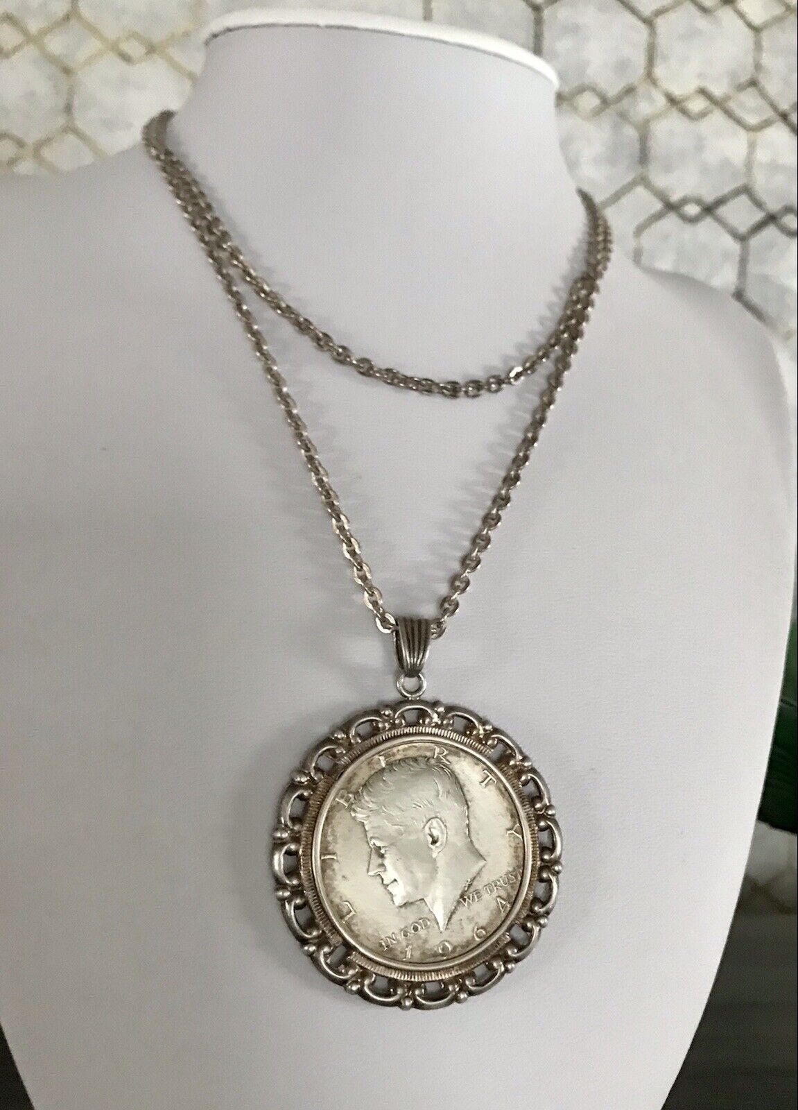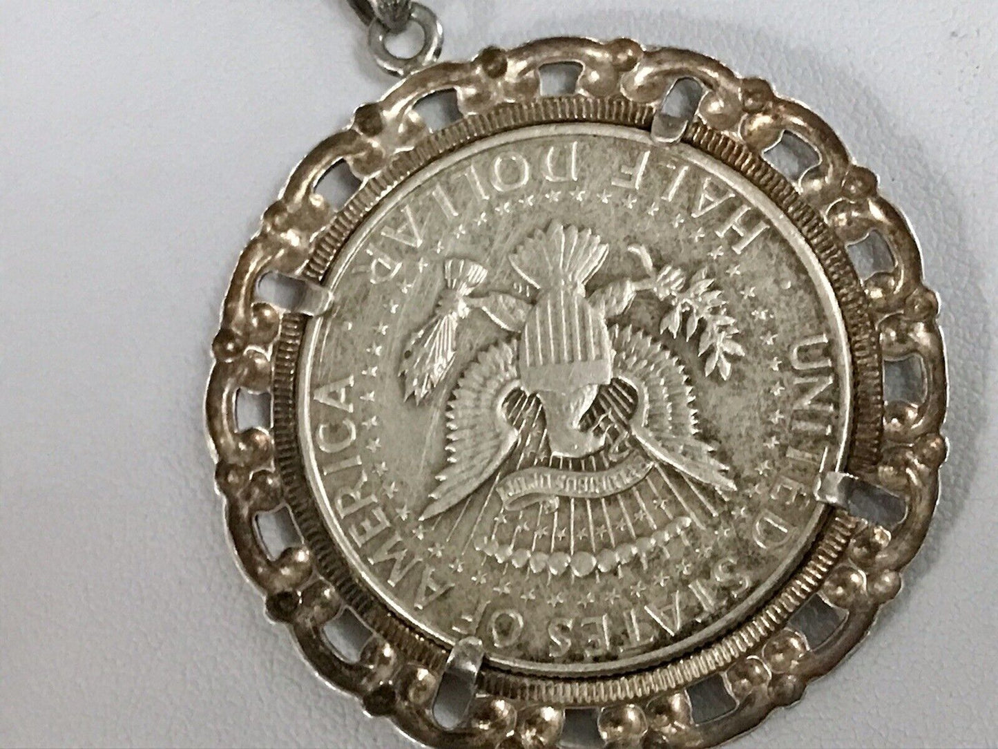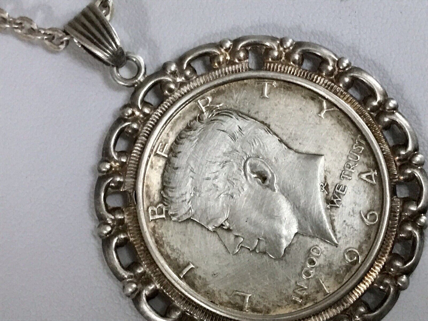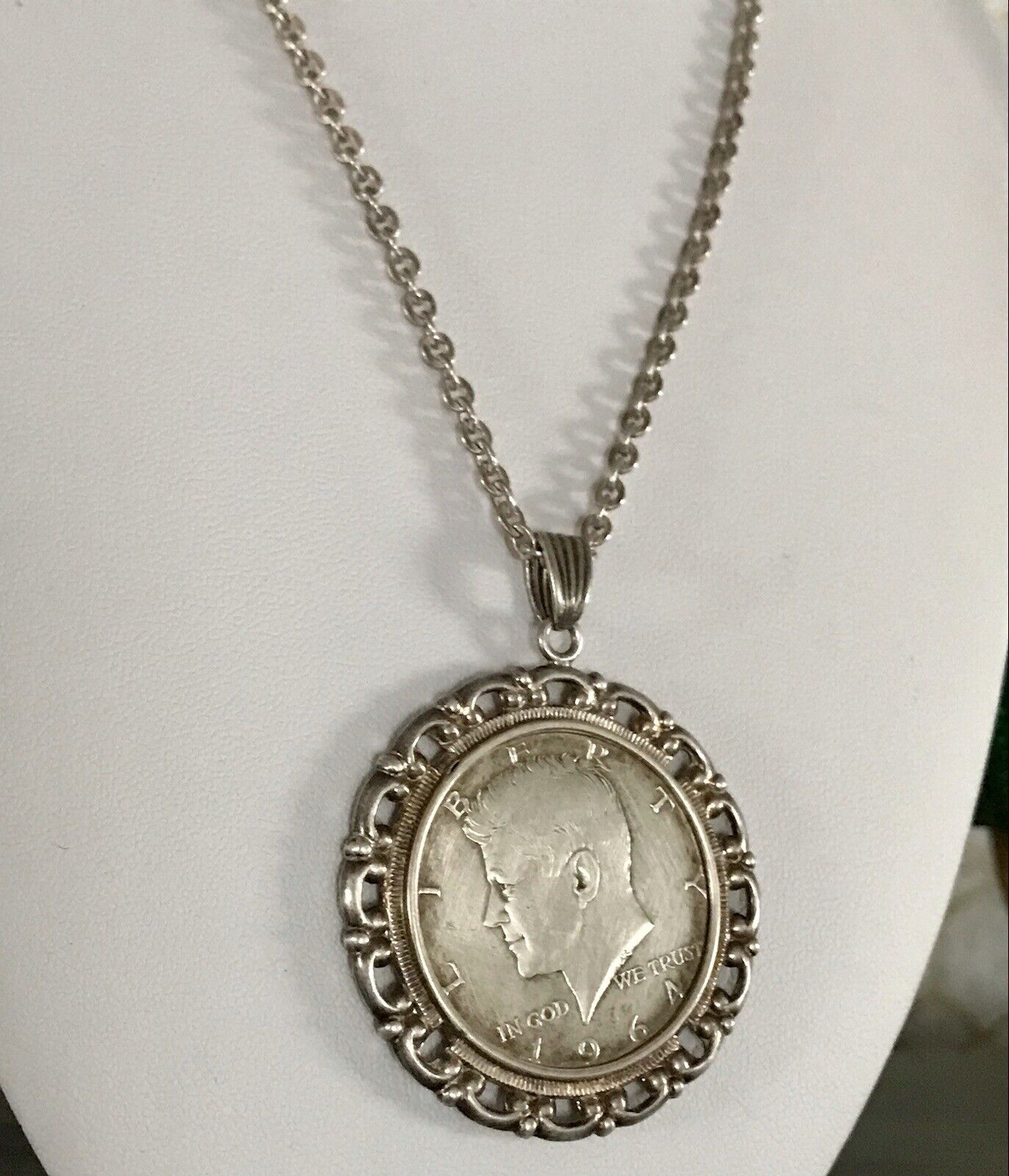Kommodengriff präsentiert eine einzigartige Vintage Silber American Dollar Münzanhänger-Kette mit Anhänger mit 1964 Kennedy Half Dollar Liberty Münze gefasst in einer 835er Zierfassung und auf langer 835er Silber-Kette