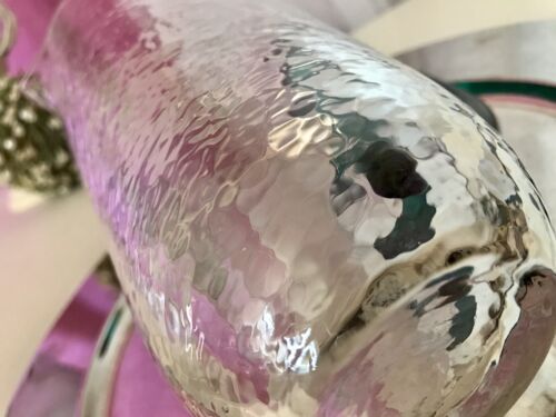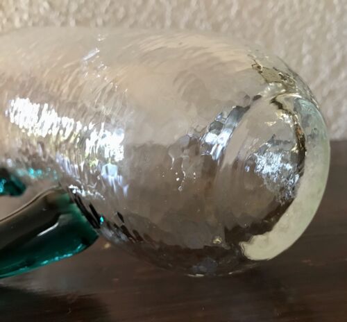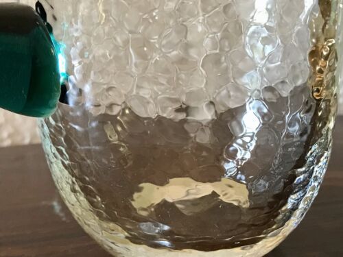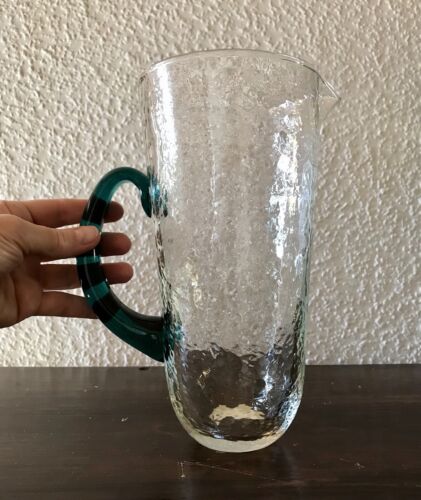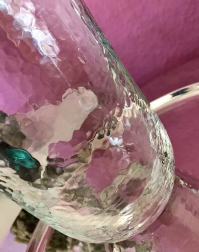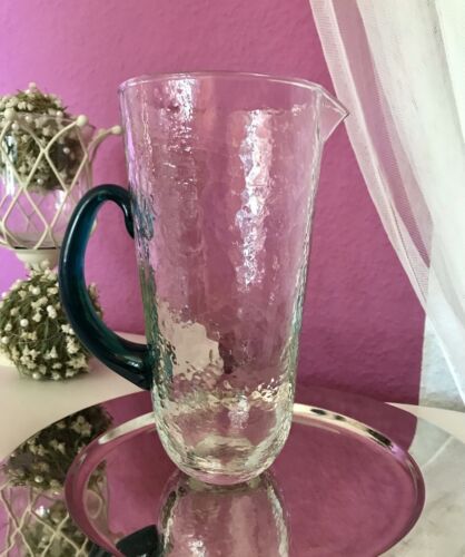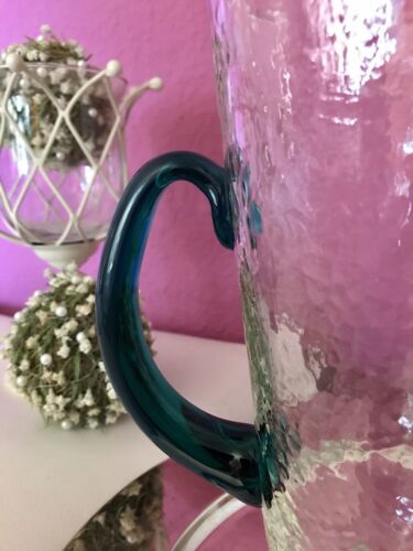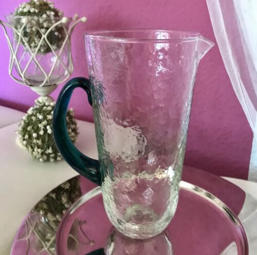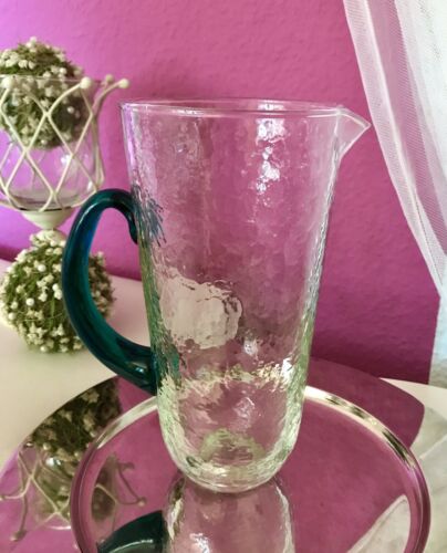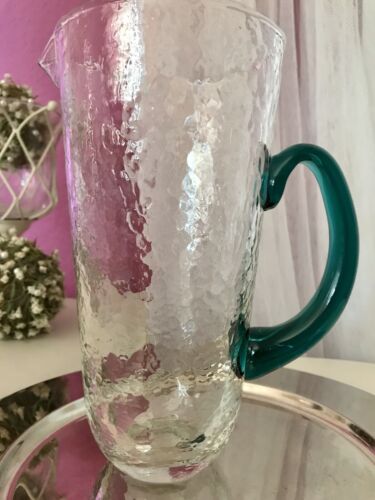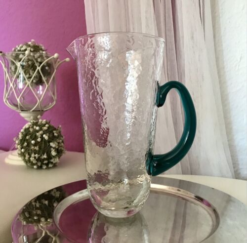 Kommodengriff präsentiert einen wunderschönen edlen mundgeblasenen Vintage Krug Kanne Glaskaraffe Karaffe Henkelkrug aus schönem Glas in Hammerschlag-Optik bzw. Craquelée-Glas/Splitterglas-Optik unf mit grünem Henkel