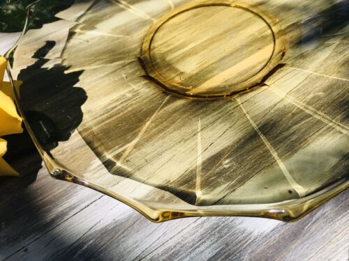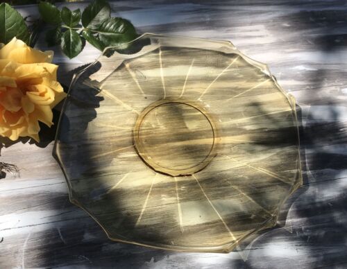C01-01Kommodengriff präsentiert eine wunderschöne alte runde bernsteinfarbene gelbe Kuchenplatte Glas-Schale Glasschale Obstteller Kuchenteller flache Schale Platte