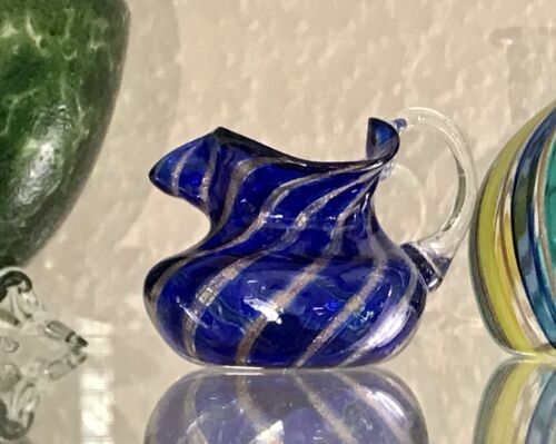 Mit gekniffenem oberen Rand und angeschmolzenen farblosen Henkel.