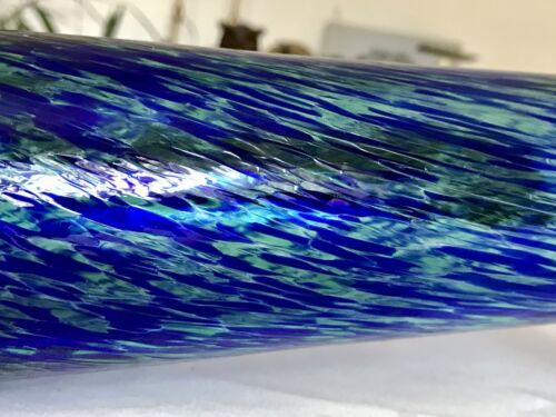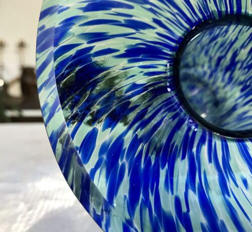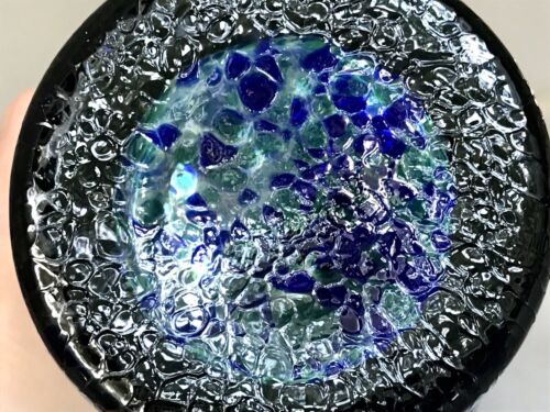 Klarglas mit grünen und blauen aufsteigenden unter Fingern ertastbaren Farbinseln.
