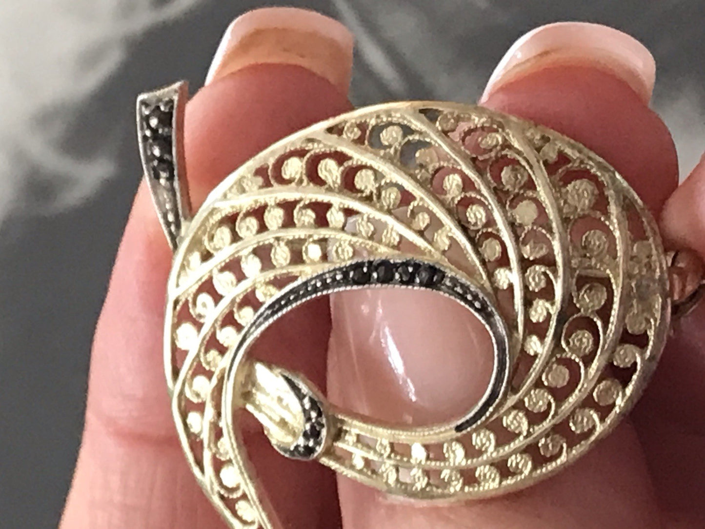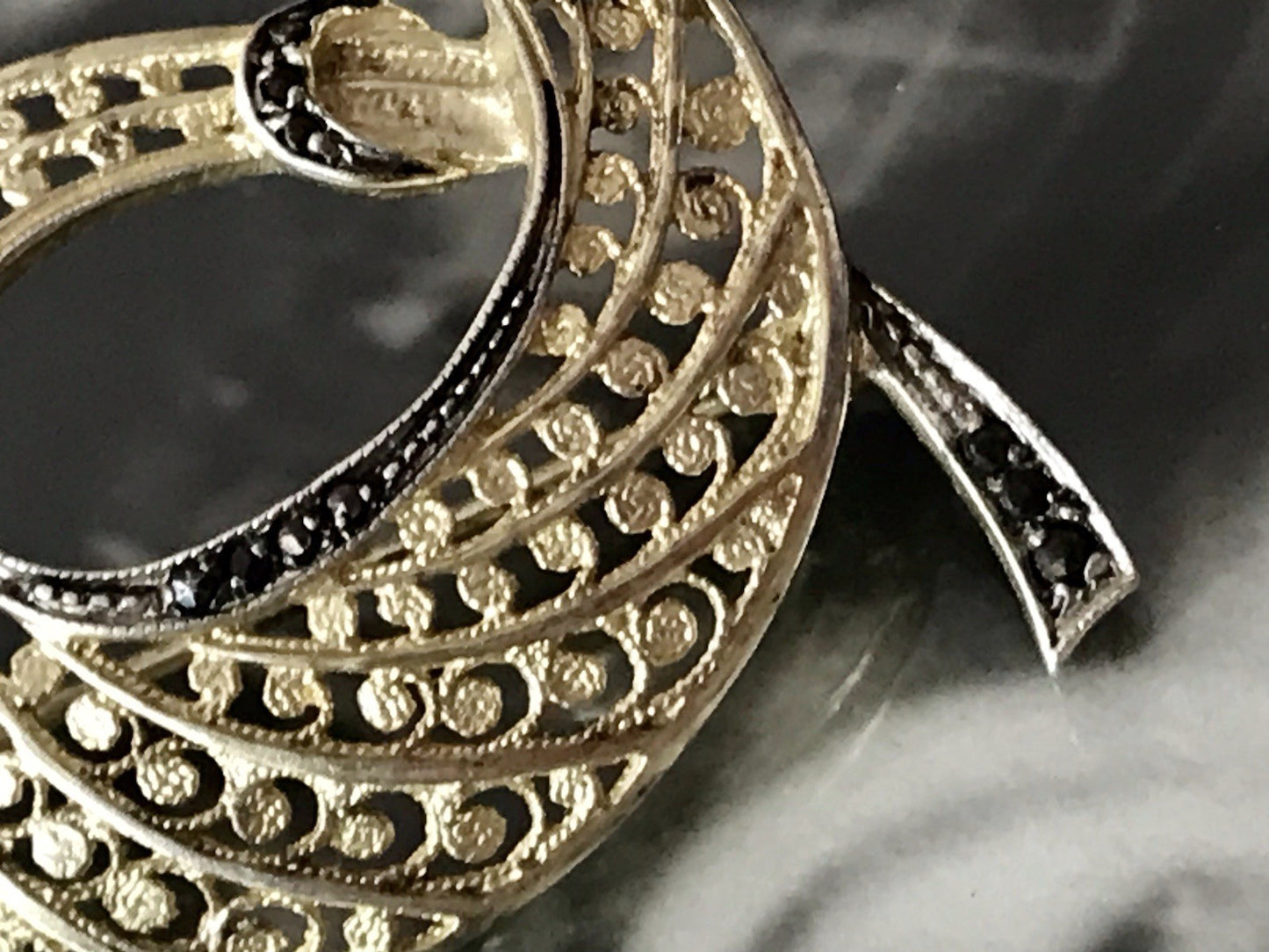 Eine sehr stilvolle Brosche aus vergoldetem Silber, teils an dunklen silberfarbenen bereits angelaufenen Parts mit Markasiten besetzt.