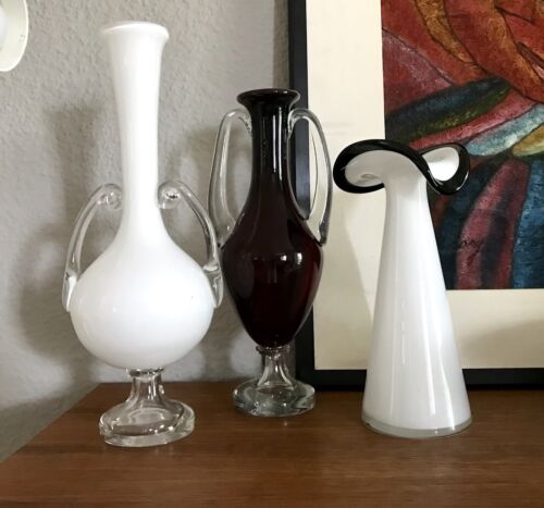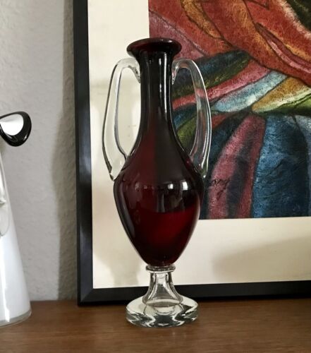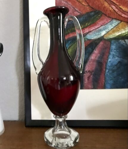 Roter Bauch und Hals, farbloser runder Stand und aufgeschmolzene künstlerisch gestalteten Henkel.