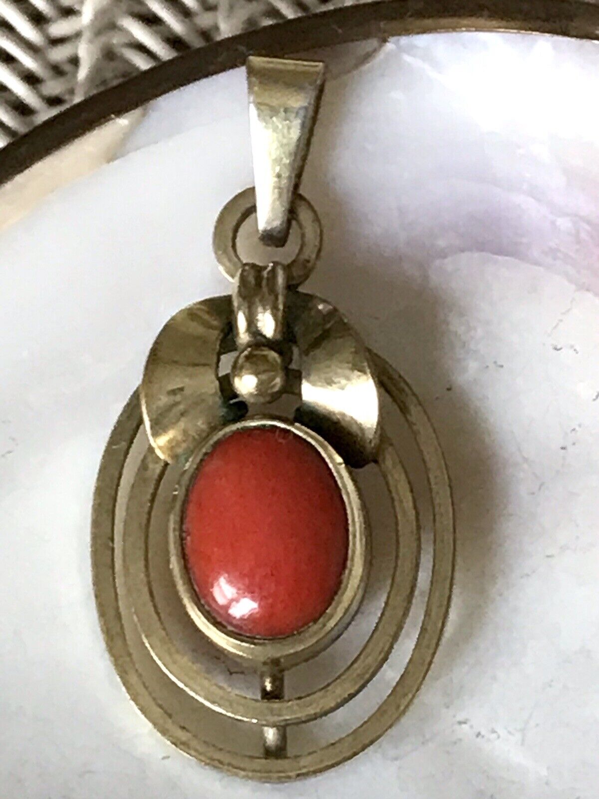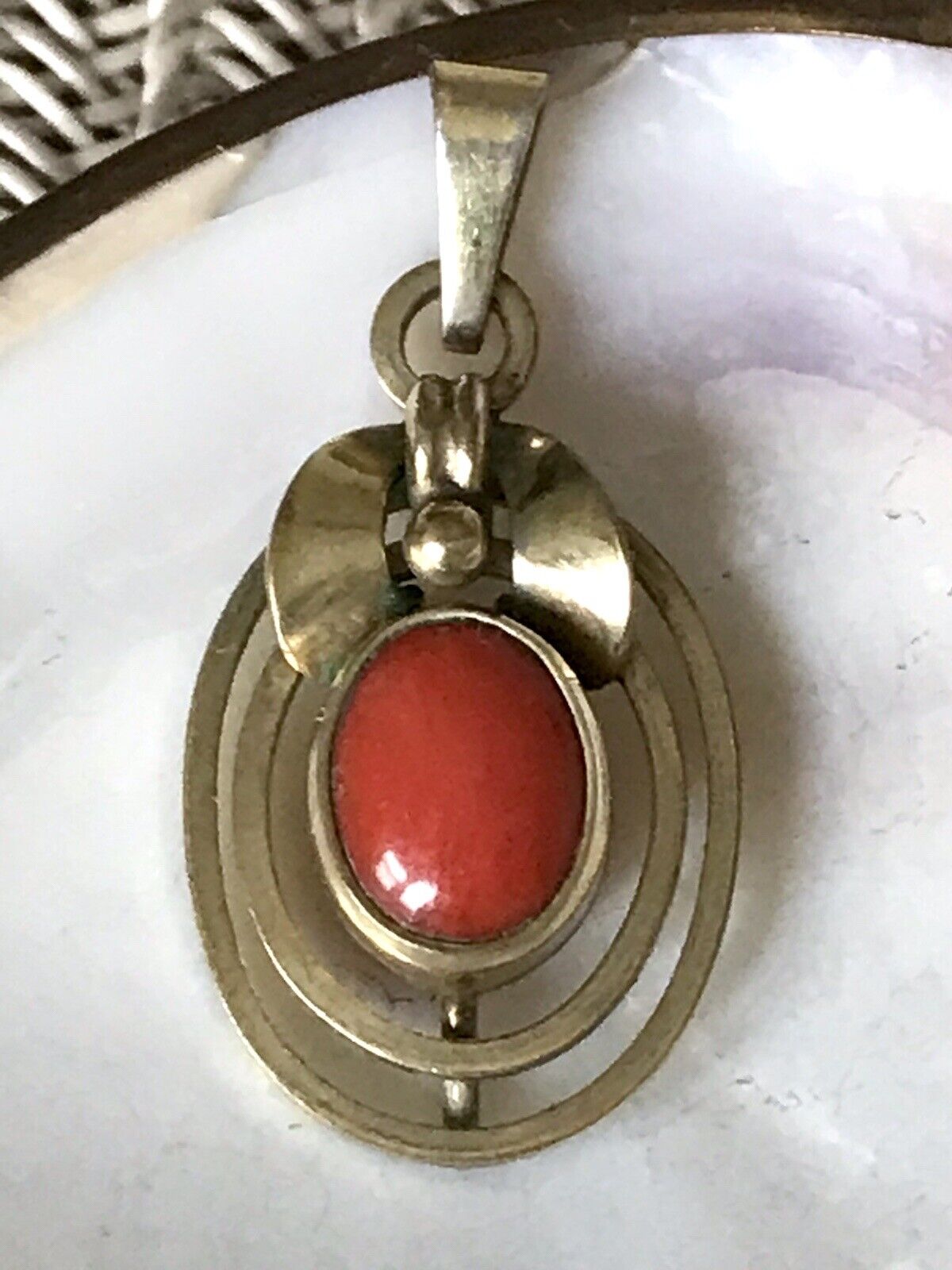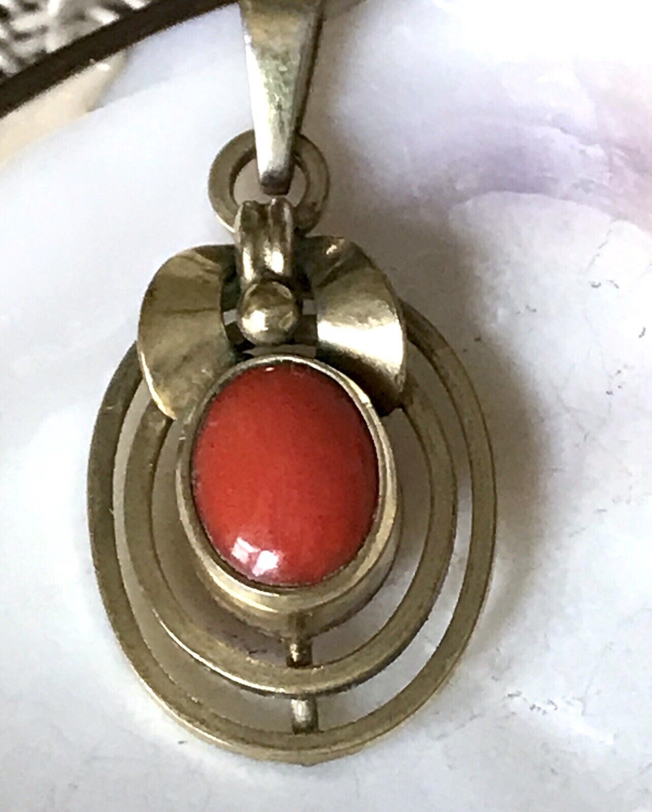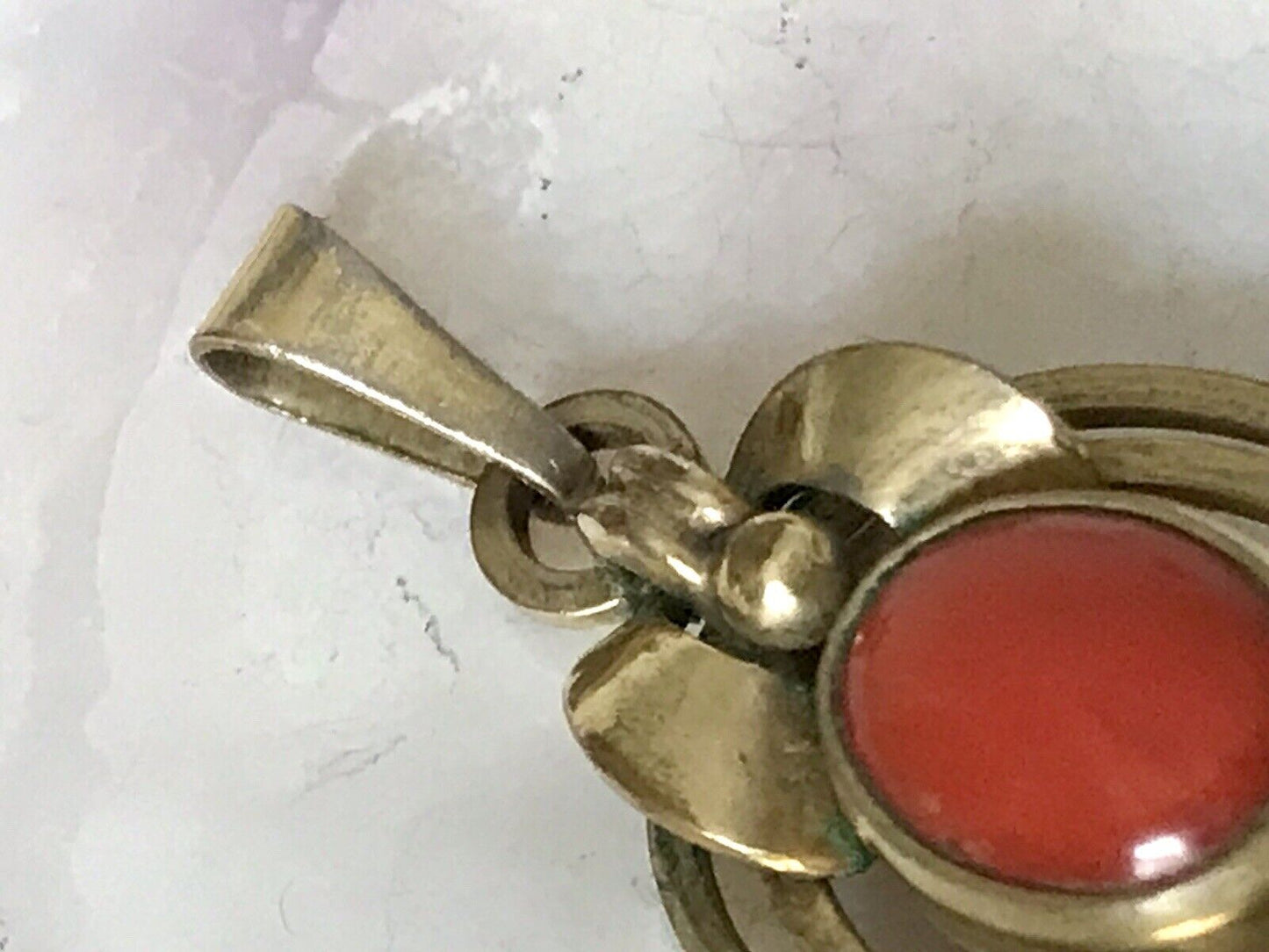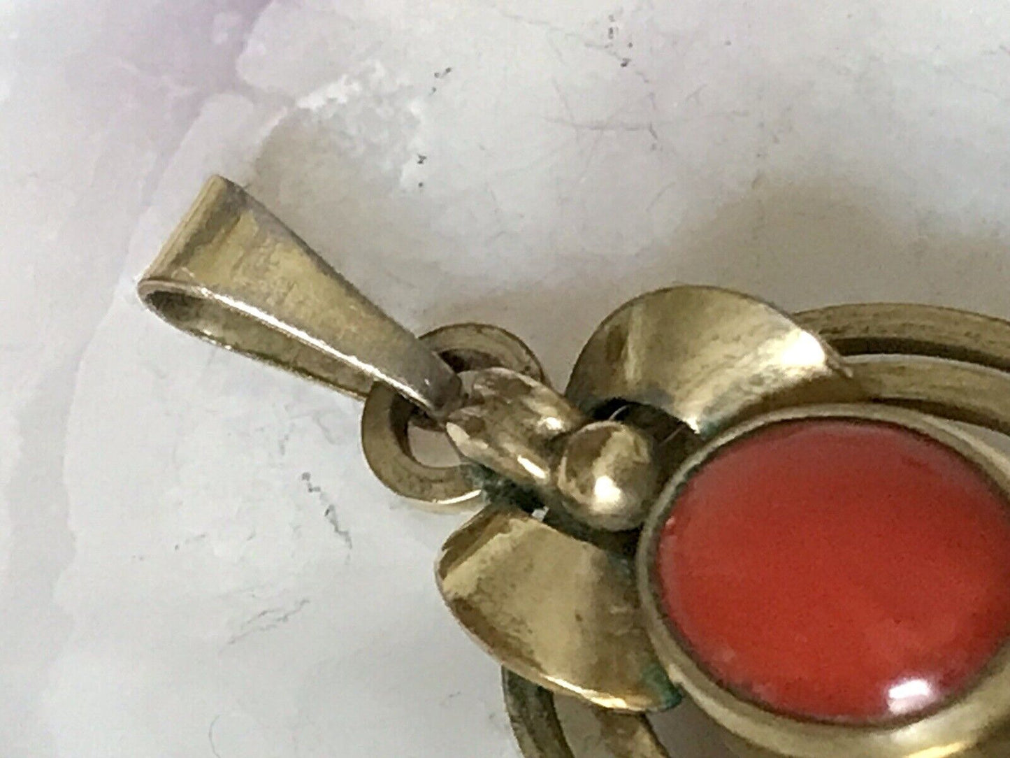 Kommodengriff präsentiert einen wunderhübschen zauberhaften alten Designer Kettenanhänger Anhänger aus Amerikaner Doublé mit wunderschönem korallenroten Stein in Cabochon-Schliff von Theodor Klotz TeKa Pforzheim