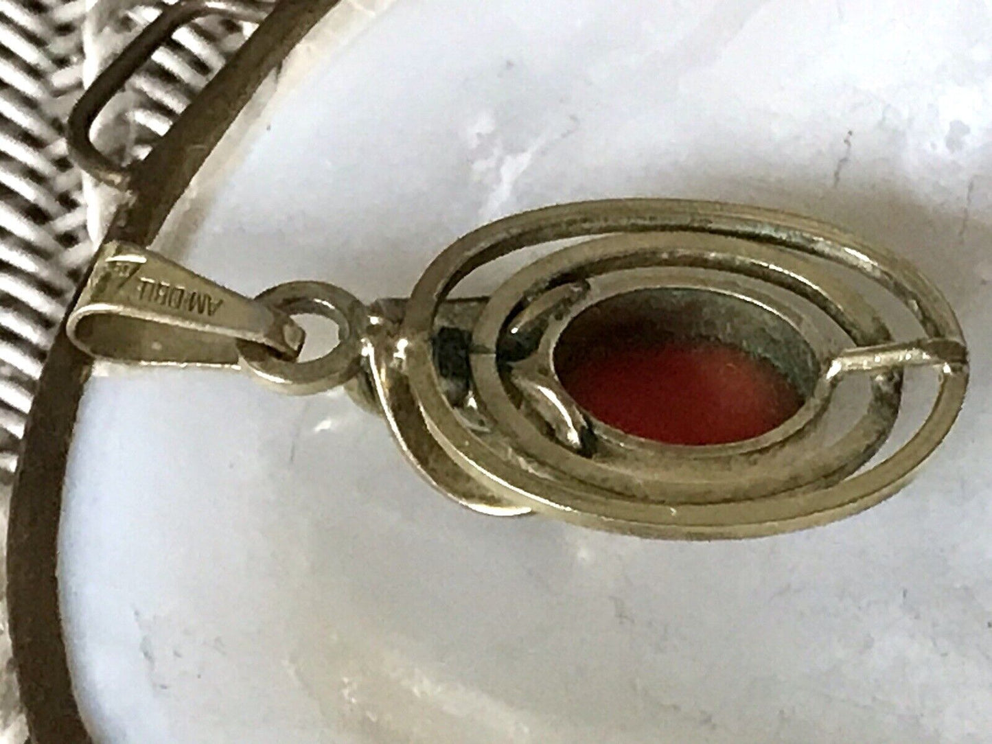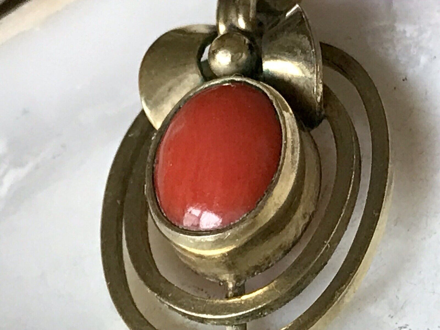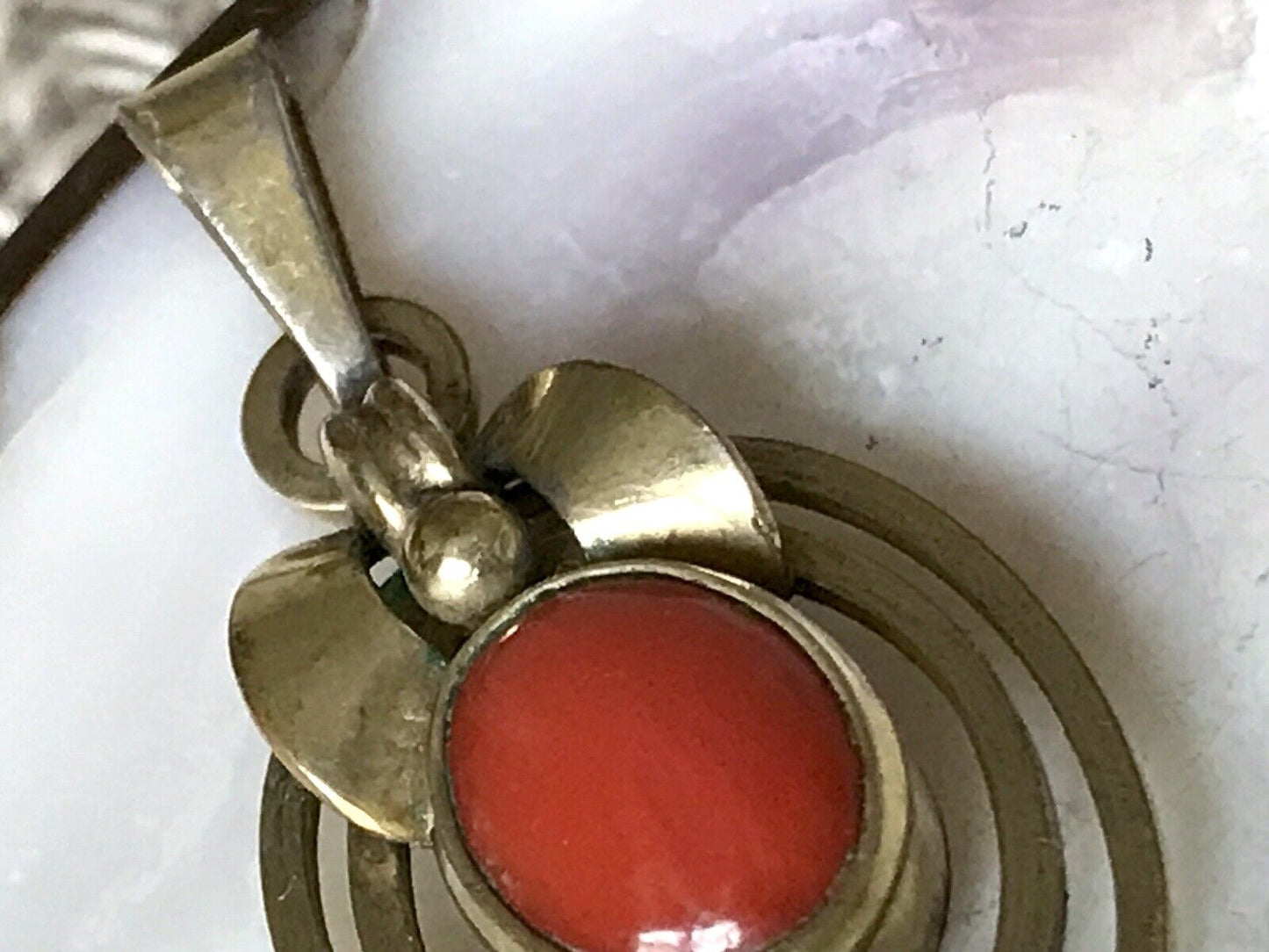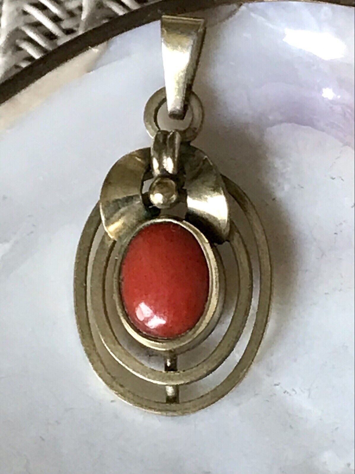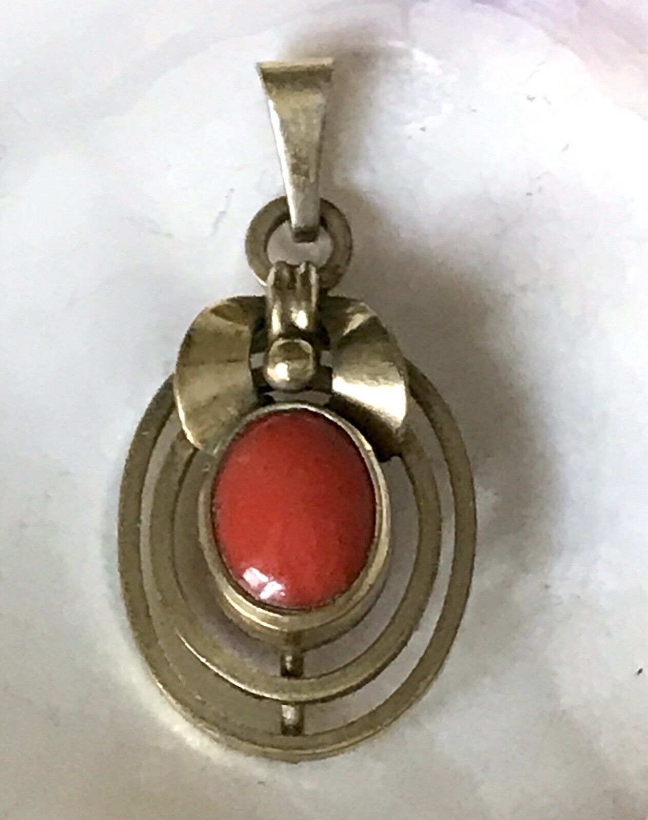 Kommodengriff präsentiert einen wunderhübschen zauberhaften alten Designer Kettenanhänger Anhänger aus Amerikaner Doublé mit wunderschönem korallenroten Stein in Cabochon-Schliff von Theodor Klotz TeKa Pforzheim