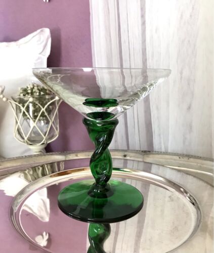 Kelch aus farblosem Kristallglas Glas und konisch geformt und sich weit öffnend, angeschmolzener radial gedrehter grüner massiver aber dennoch elegant wirkender Schaft.