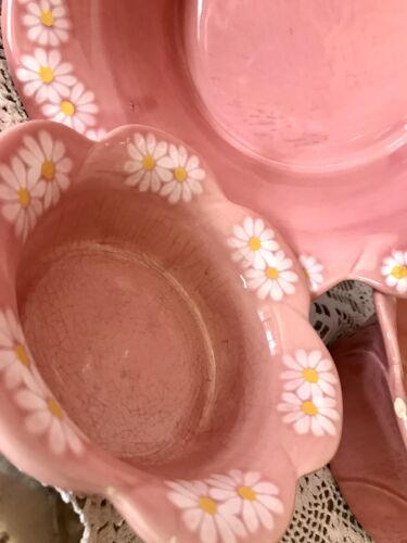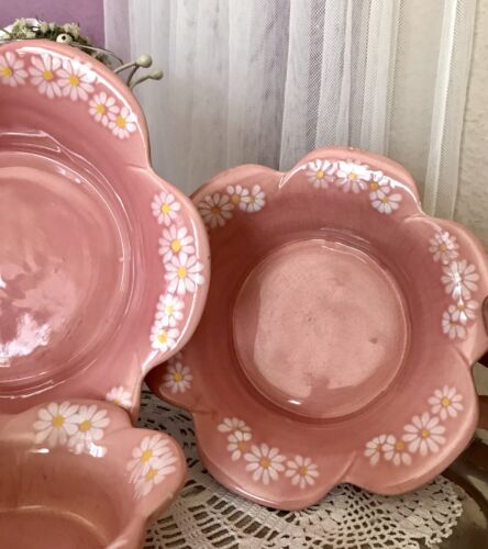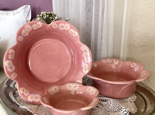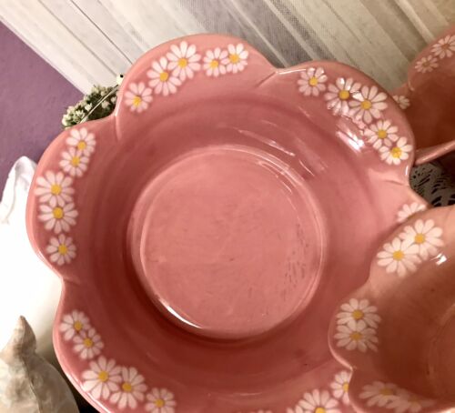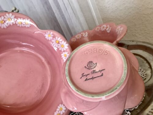 Schön ausgeformt und handgemalt mit umlaufendem Margheriten oder Gänseblümchen-Bordüre am oberen gewellten Rand der schönen rosafarbenen wundervollen Schalen.